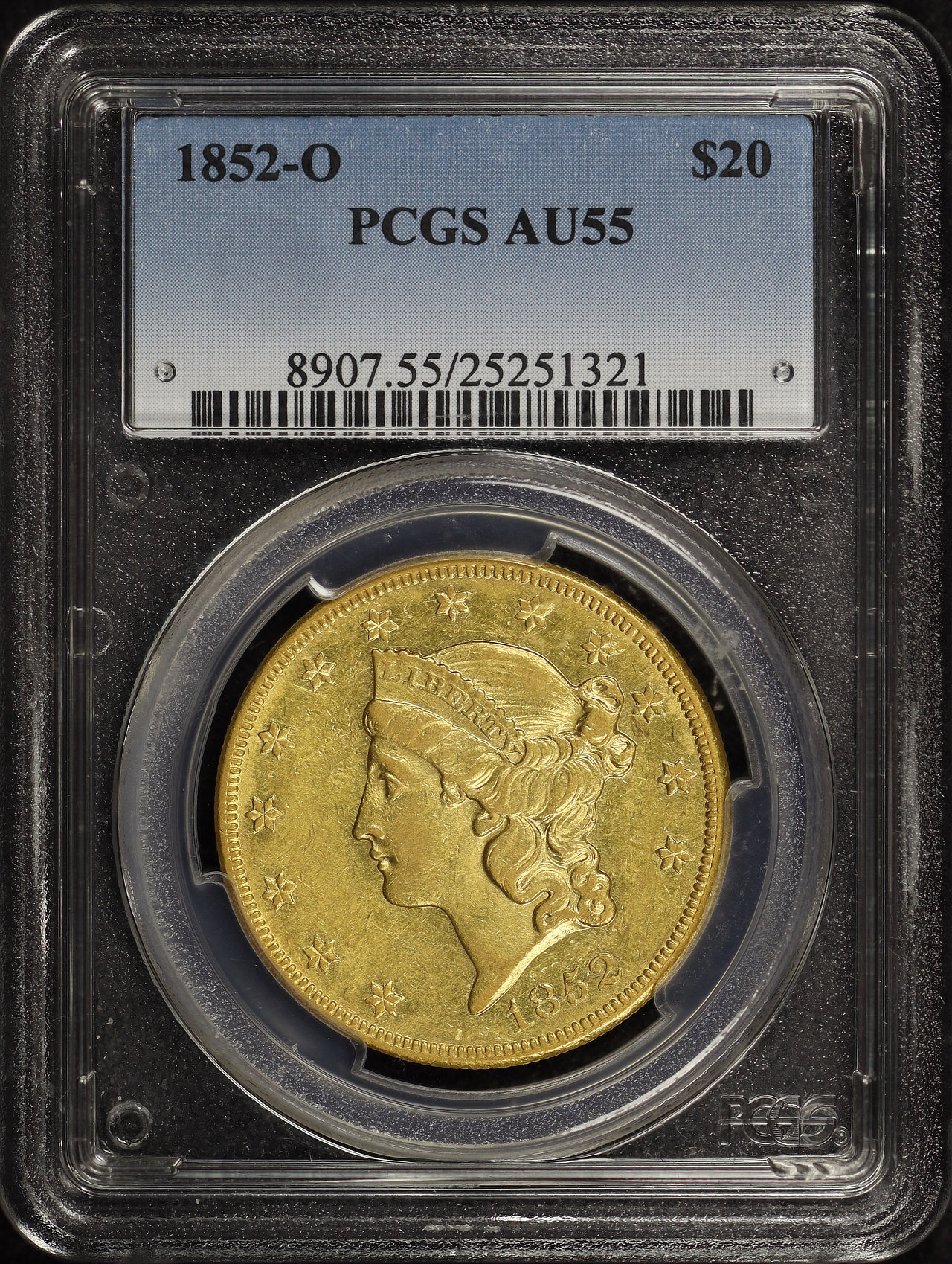 The 1852-O $20 Gold is part of a series of Twenty Dollar Gold Double Eagle coins struck from 1849-1907. Struck in New Orleans and designated as a Business (MS) strike, this coin is made of 90% gold; 10% copper from a mintage of 190,000 struck.