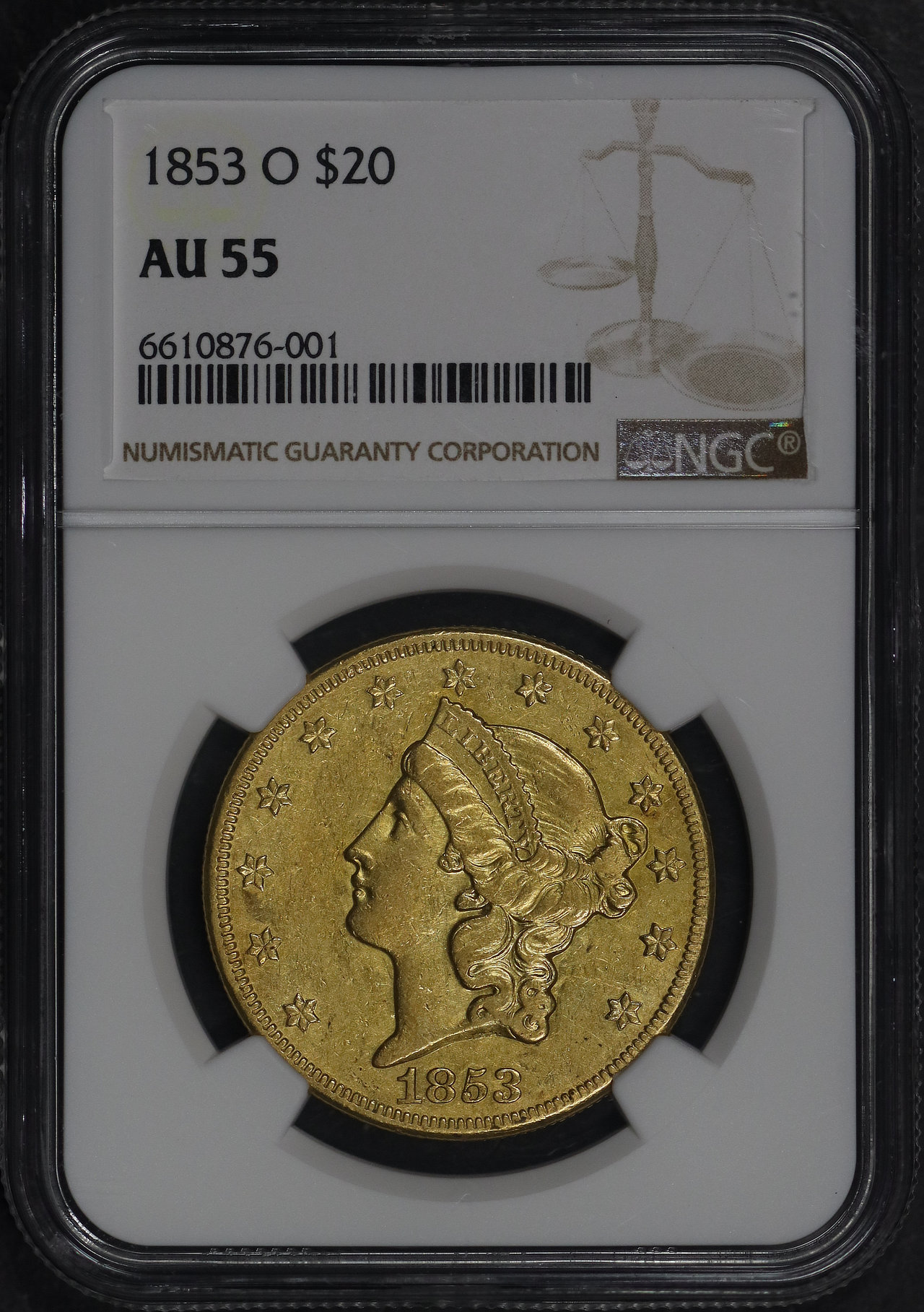 The 1853-O $20 Gold is part of a series of Twenty Dollar Gold Double Eagle coins struck from 1849-1907. Struck in New Orleans and designated as a Business (MS) strike, this coin is made of 90% gold; 10% copper from a mintage of 71,000 struck.
