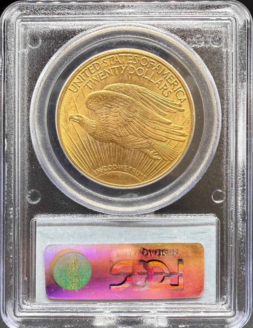 Reverse: A crescent sun appears at the bottom as if rising on the horizon with long rays extending to the top of the coin. A flying eagle covers the central portion, atop the rays. The words UNITED STATES oF AMERICA, TWENTY DOLLARS appear on the top periphery.