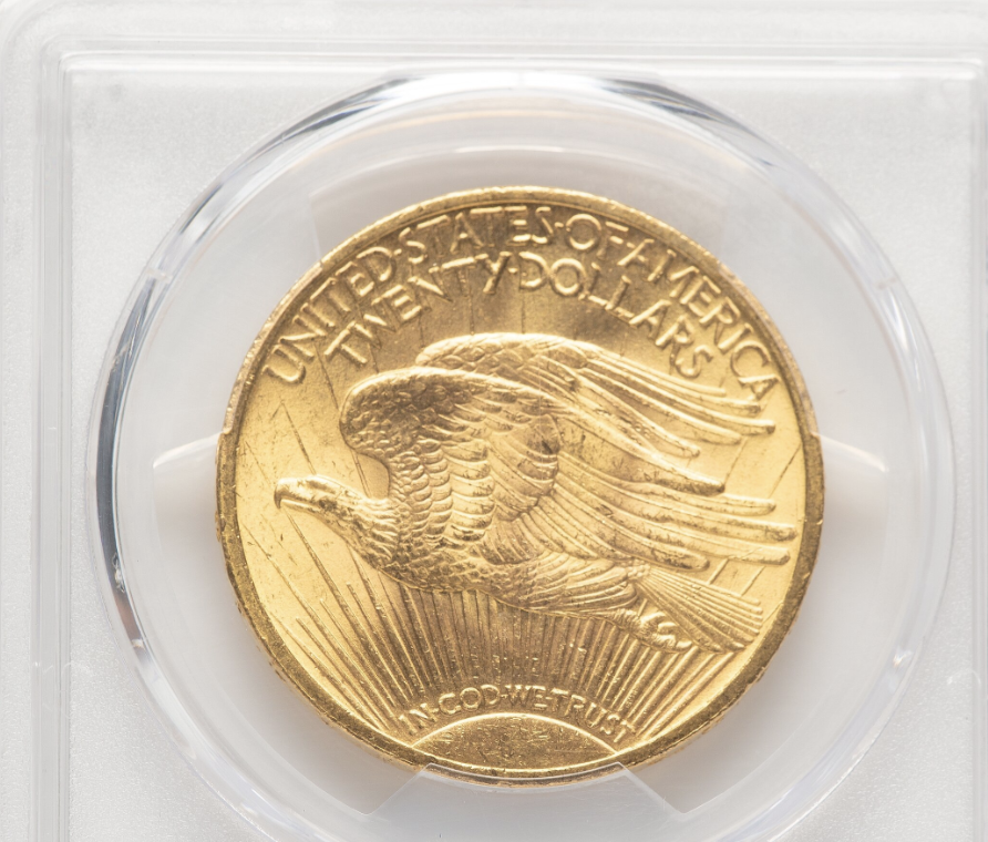 Reverse: A crescent sun appears at the bottom as if rising on the horizon with long rays extending to the top of the coin. A flying eagle covers the central portion, atop the rays. The words UNITED STATES oF AMERICA, TWENTY DOLLARS appear on the top periphery.