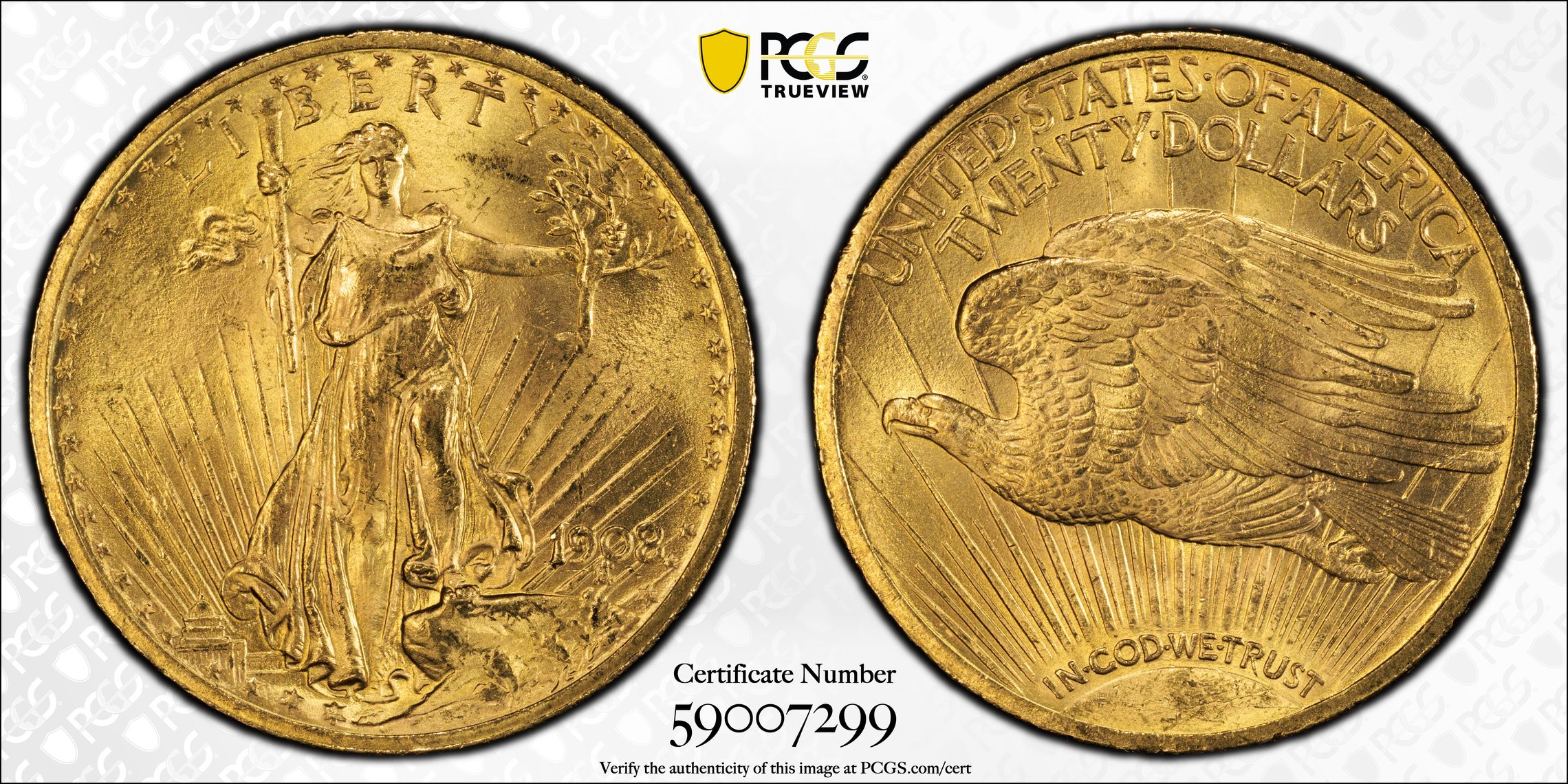 By the second year of the Saint-Gaudens double eagle's production, the public was expressing bother over the absence of the motto IN GOD WE TRUST on the new $20 coin. Thus, the decision was made to add the national motto on the coin just above the sun disk emerging from the bottom of the reverse. The 1908 With motto Saint-Gaudens double eagle is common enough as an issue, though nice uncirculated examples prove quite scarce, with many devoid of exceptional luster. Gems are truly rare, commanding strong premiums particularly when two or more registry set collectors are vying for the same piece.