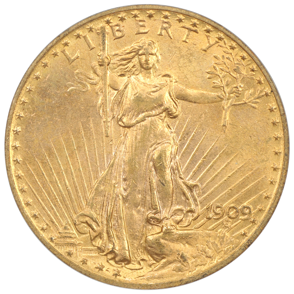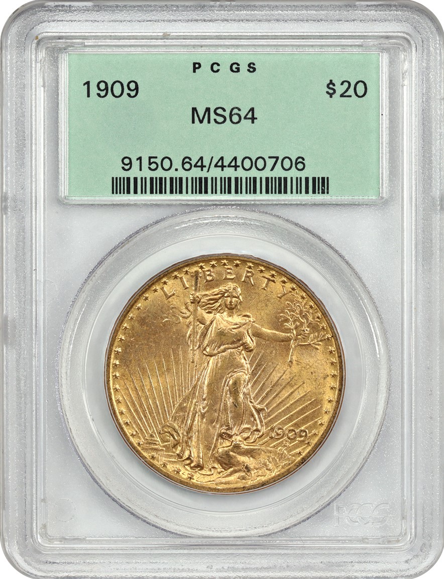 The 1909 Saint-Gaudens $20 is a scarcer issue among the series, but widely available in circulated and lower uncirculated grades. In grades of about MS64 and up, the 1909 is a true rarity, with true Gems numbering perhaps to only a few dozen pieces total. Most 1909 Saints are sharply struck, and of the high-end pieces that exist the majority offer exceptional luster and eye appeal.