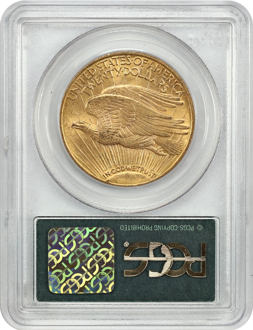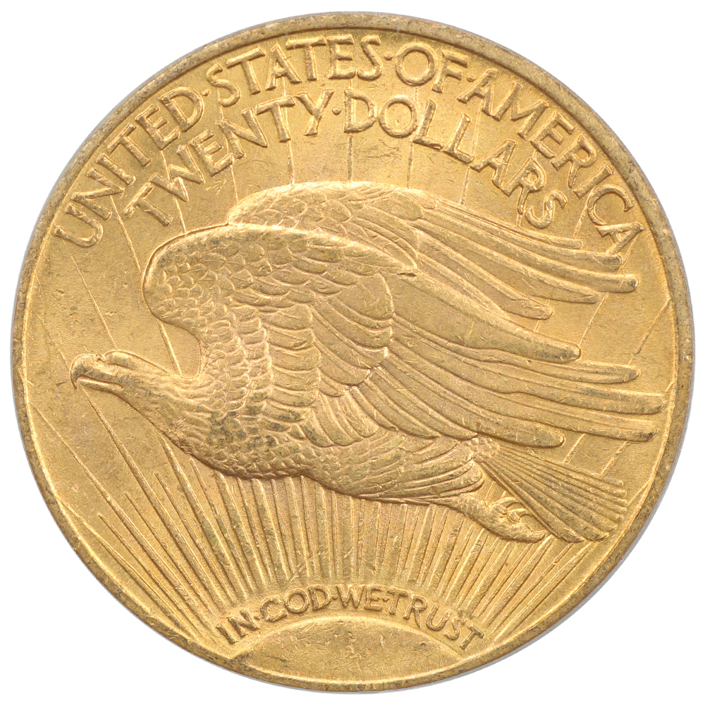Reverse: A crescent sun appears at the bottom as if rising on the horizon with long rays extending to the top of the coin. A flying eagle covers the central portion, atop the rays. The words UNITED STATES oF AMERICA, TWENTY DOLLARS appear on the top periphery.