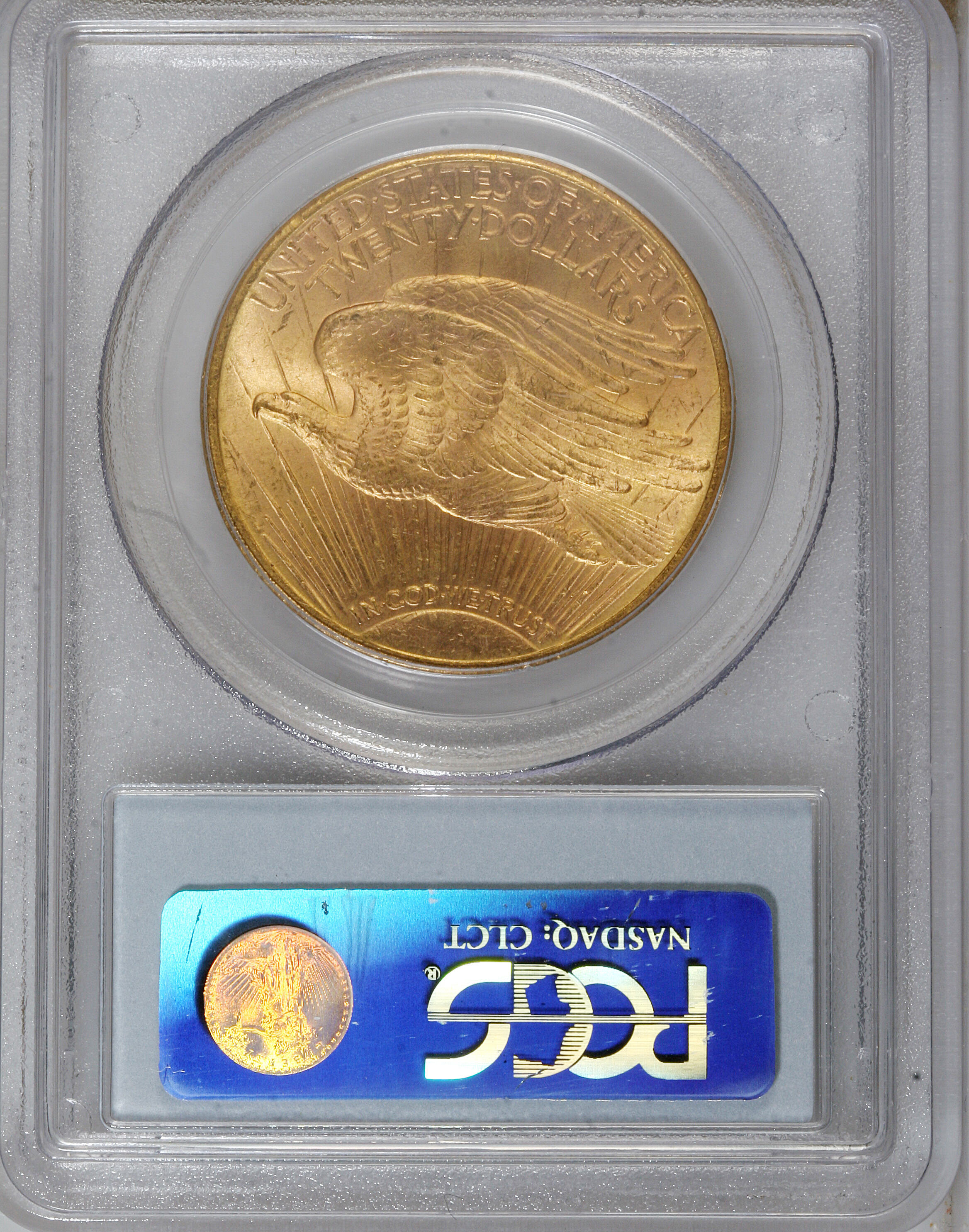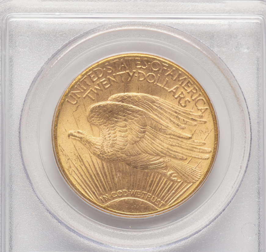 Reverse: A crescent sun appears at the bottom as if rising on the horizon with long rays extending to the top of the coin. A flying eagle covers the central portion, atop the rays. The words UNITED STATES oF AMERICA, TWENTY DOLLARS appear on the top periphery.