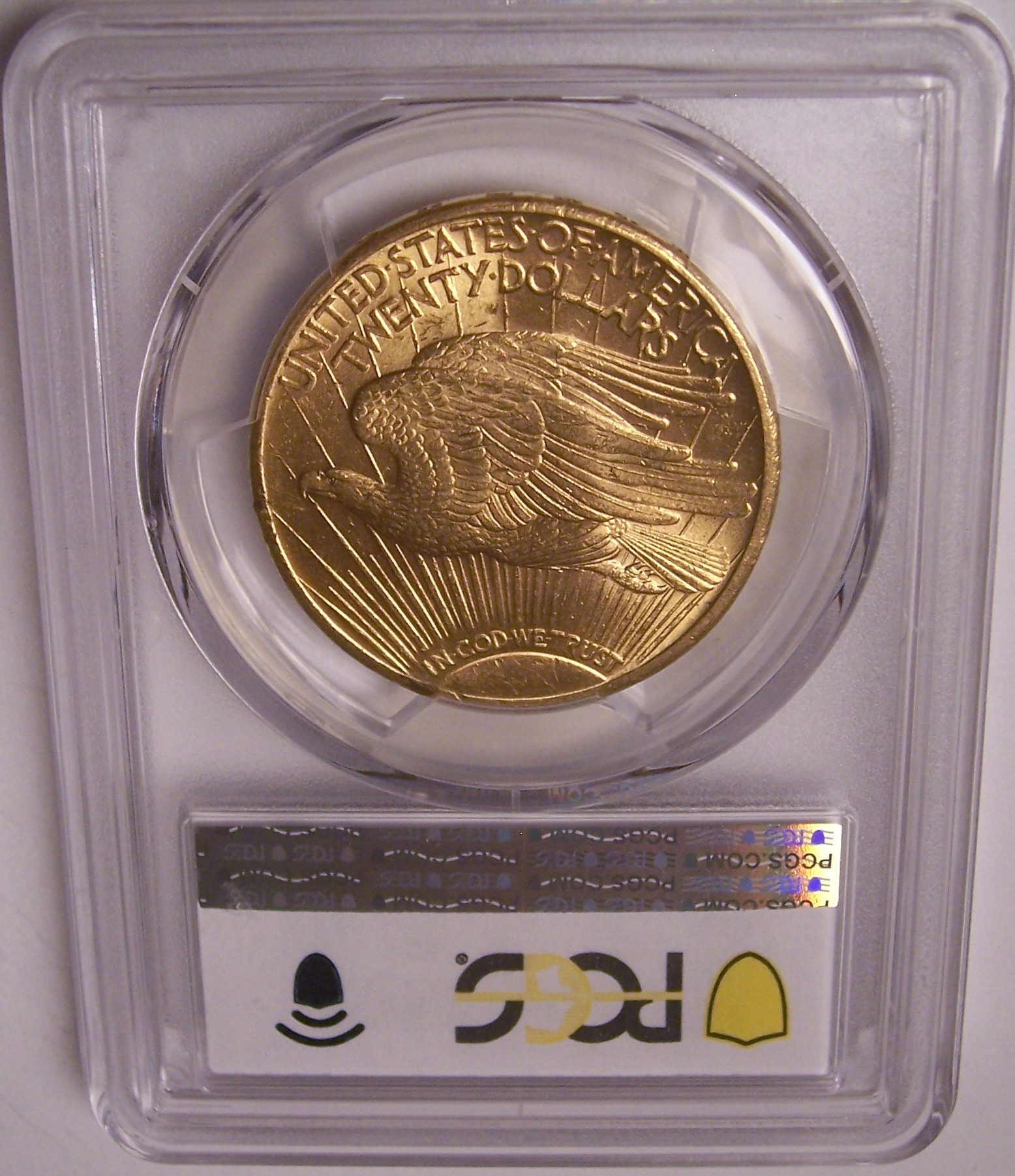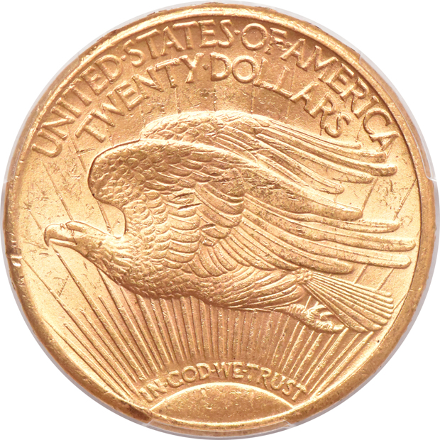 Reverse: A crescent sun appears at the bottom as if rising on the horizon with long rays extending to the top of the coin. A flying eagle covers the central portion, atop the rays. The words UNITED STATES oF AMERICA, TWENTY DOLLARS appear on the top periphery.