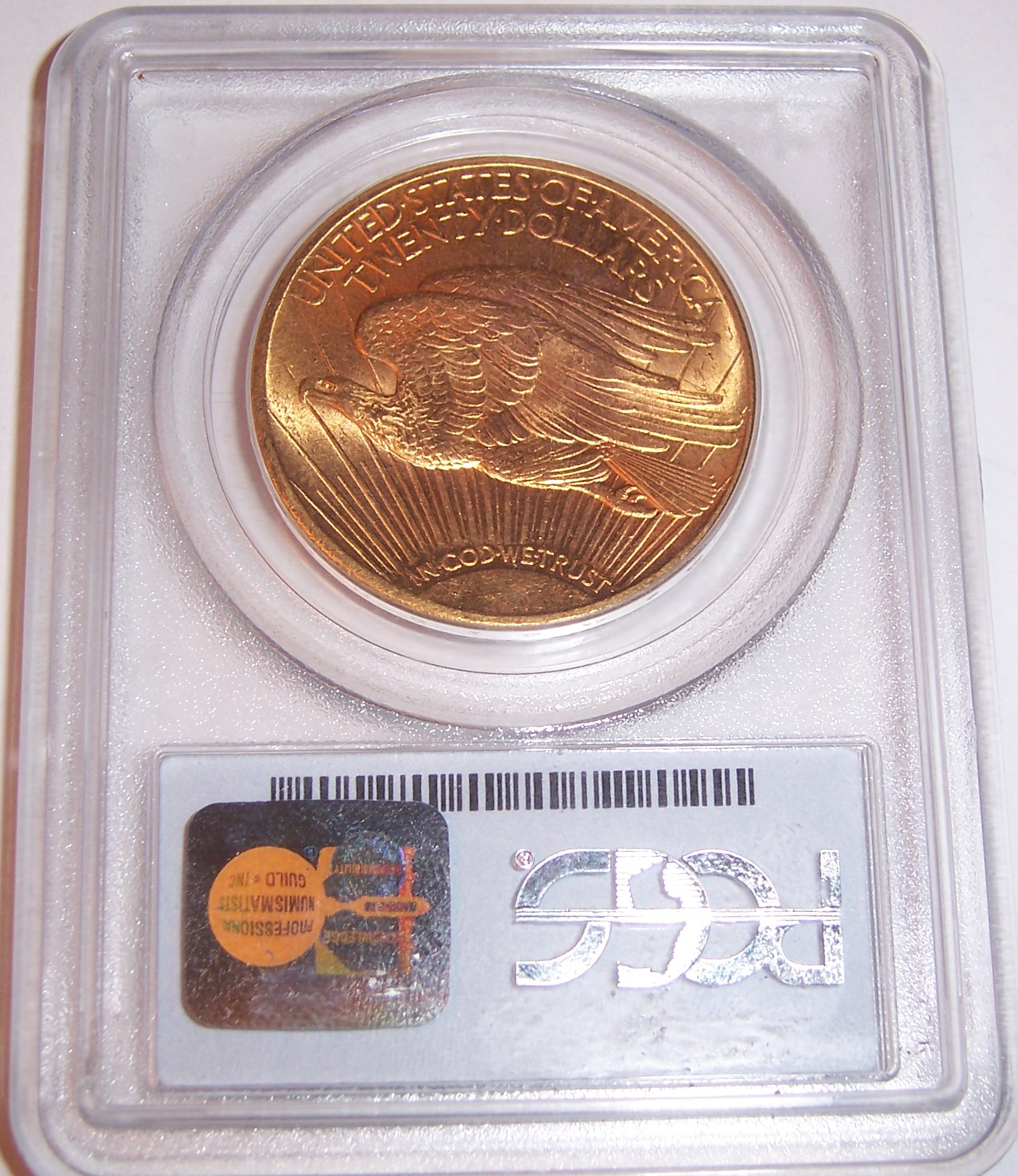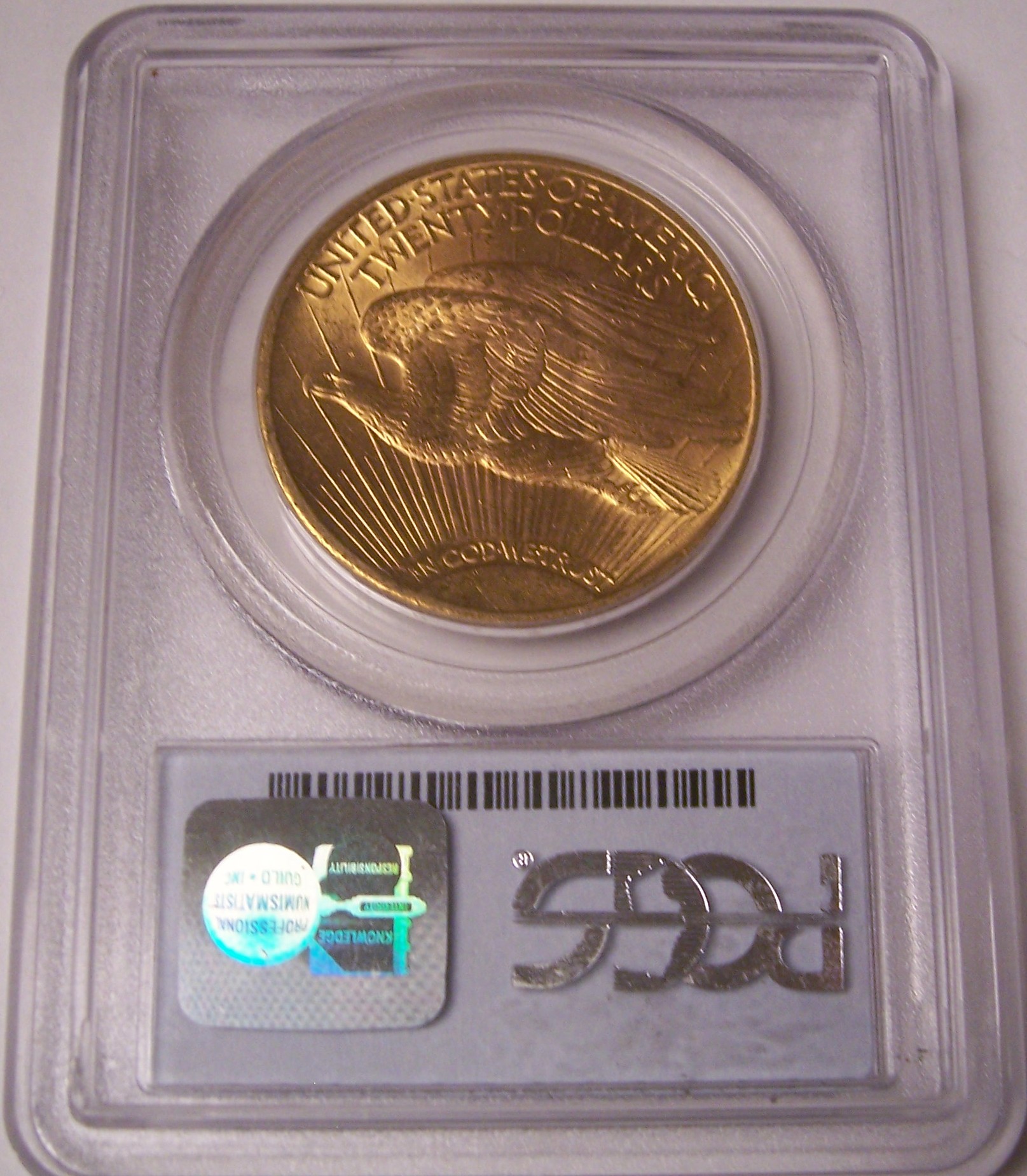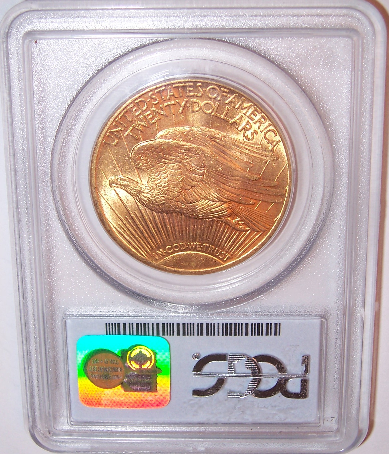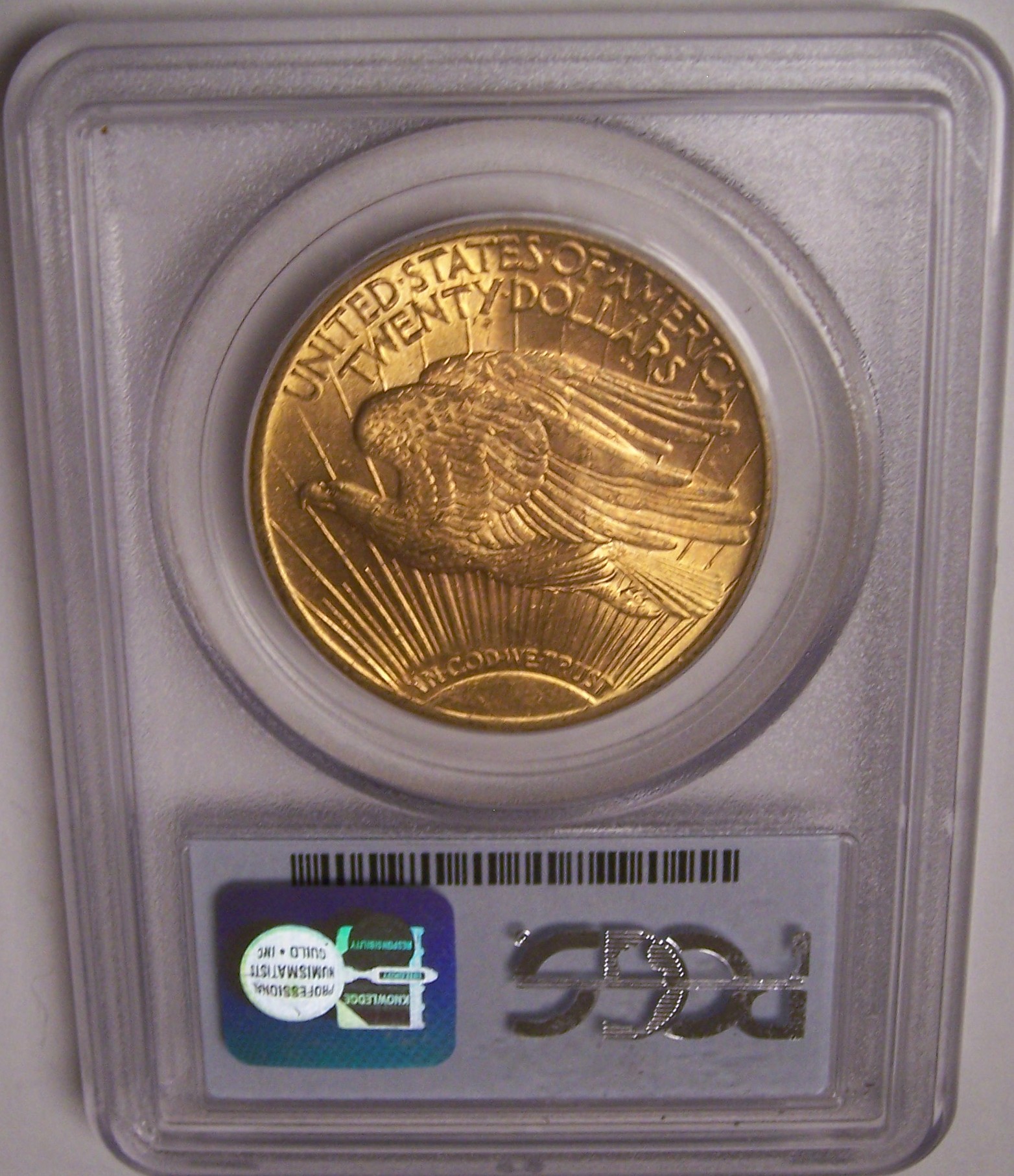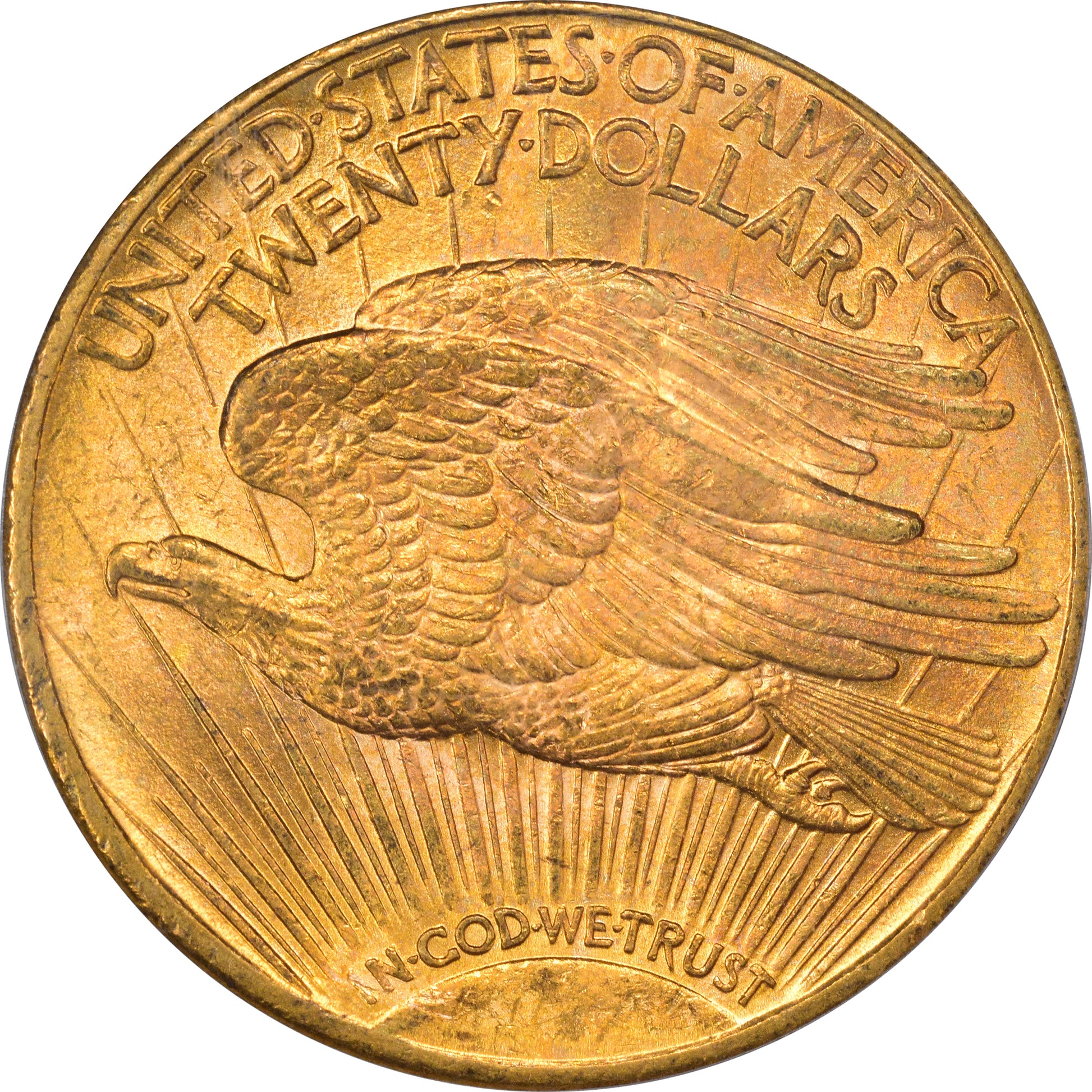 Reverse: A crescent sun appears at the bottom as if rising on the horizon with long rays extending to the top of the coin. A flying eagle covers the central portion, atop the rays. The words UNITED STATES oF AMERICA, TWENTY DOLLARS appear on the top periphery.