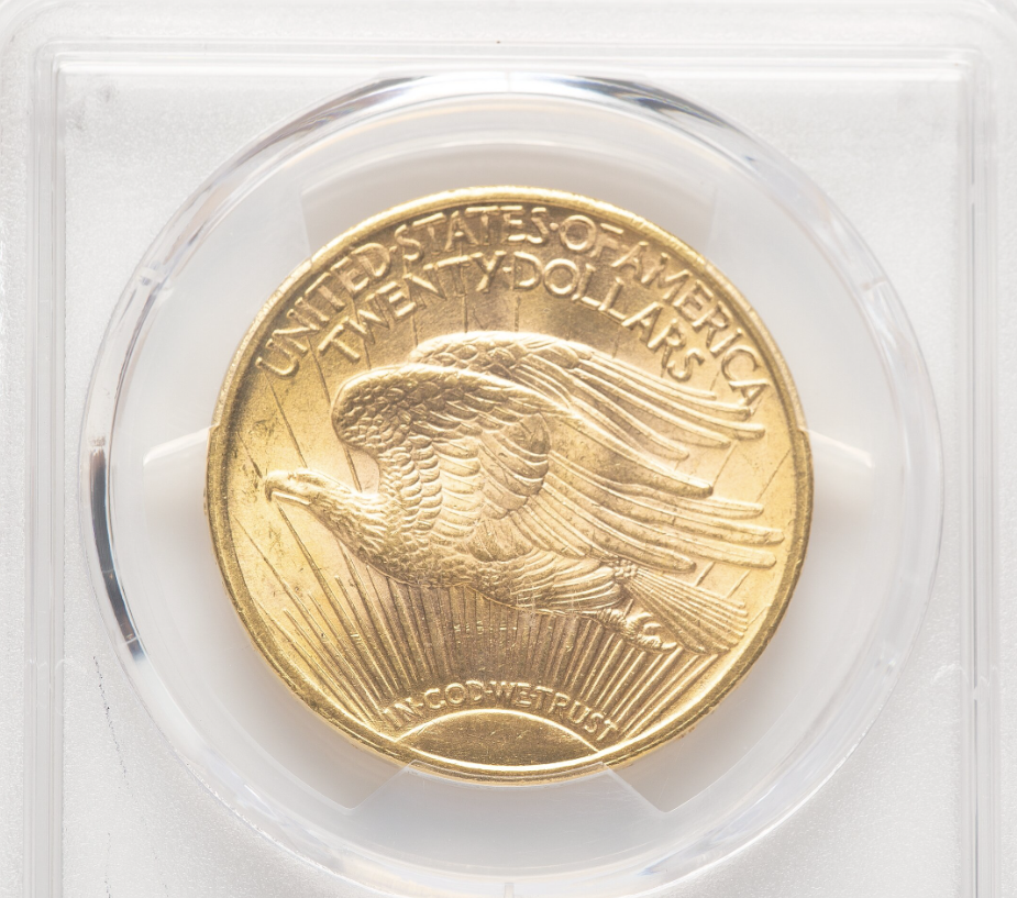 Reverse: A crescent sun appears at the bottom as if rising on the horizon with long rays extending to the top of the coin. A flying eagle covers the central portion, atop the rays. The words UNITED STATES oF AMERICA, TWENTY DOLLARS appear on the top periphery.