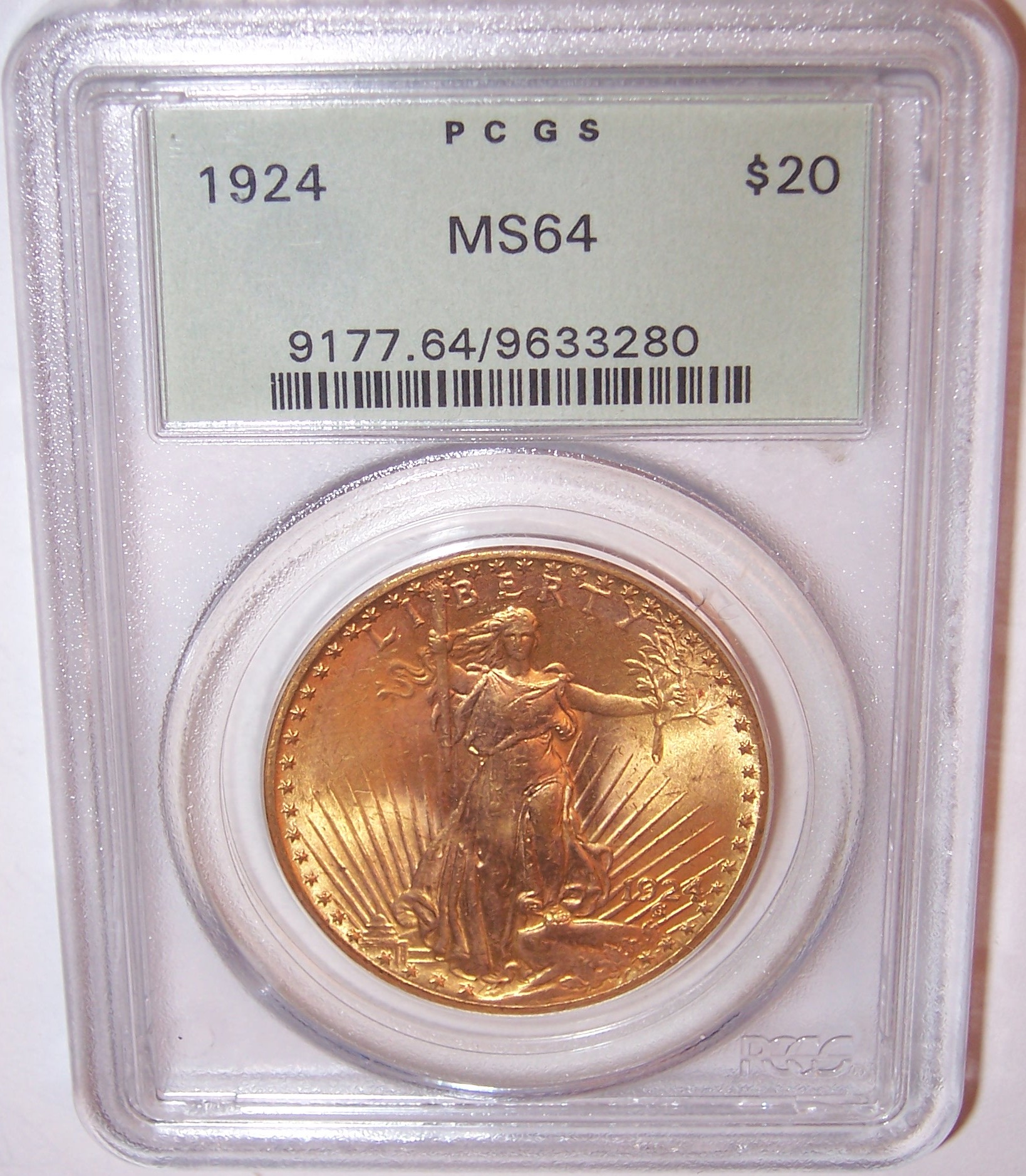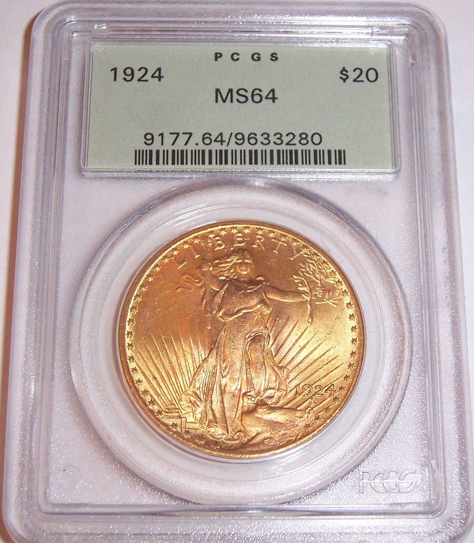 One of the most frequently encountered Saint-Gaudens coins is the 1924 Philly $20. Plentiful in circulated condition and even up to Gem, one who seeks an example -- even an especially nice piece -- should have little trouble locating it. MS66s are readily available, and there is a small but significant supply of MS67s. A tiny handful of examples are known in higher grades, and these often trade for huge premiums, particularly when registry set collectors get involved in the bidding.