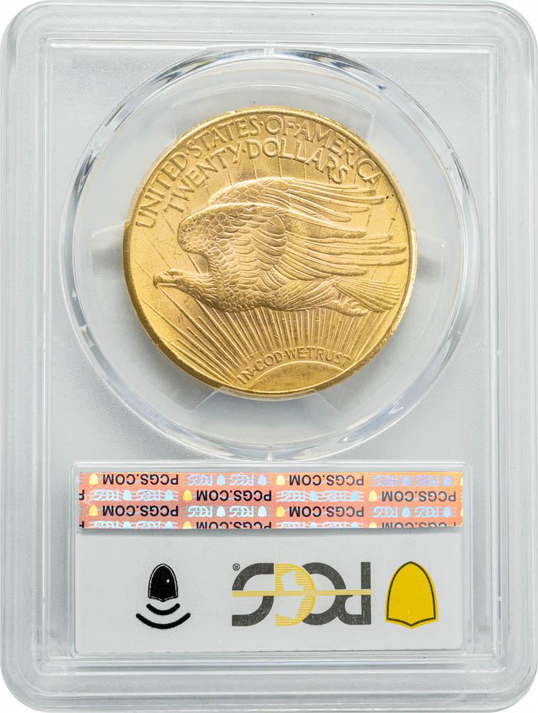 Reverse: A crescent sun appears at the bottom as if rising on the horizon with long rays extending to the top of the coin. A flying eagle covers the central portion, atop the rays. The words UNITED STATES oF AMERICA, TWENTY DOLLARS appear on the top periphery.