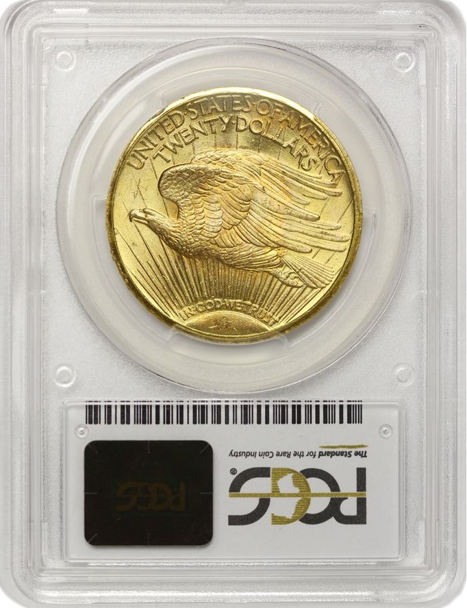 Reverse: A crescent sun appears at the bottom as if rising on the horizon with long rays extending to the top of the coin. A flying eagle covers the central portion, atop the rays. The words UNITED STATES oF AMERICA, TWENTY DOLLARS appear on the top periphery.