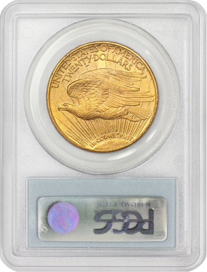 Reverse: A crescent sun appears at the bottom as if rising on the horizon with long rays extending to the top of the coin. A flying eagle covers the central portion, atop the rays. The words UNITED STATES oF AMERICA, TWENTY DOLLARS appear on the top periphery.
