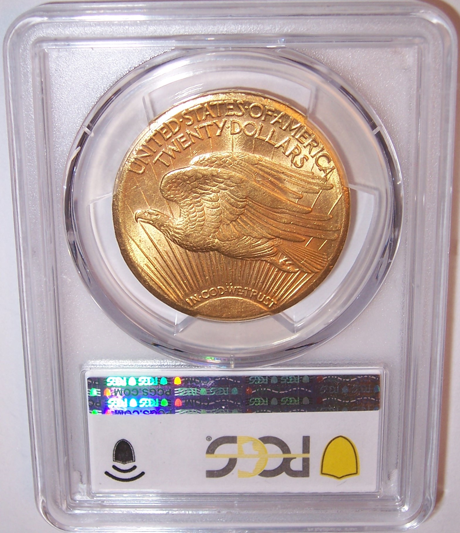 Reverse: A crescent sun appears at the bottom as if rising on the horizon with long rays extending to the top of the coin. A flying eagle covers the central portion, atop the rays. The words UNITED STATES oF AMERICA, TWENTY DOLLARS appear on the top periphery.