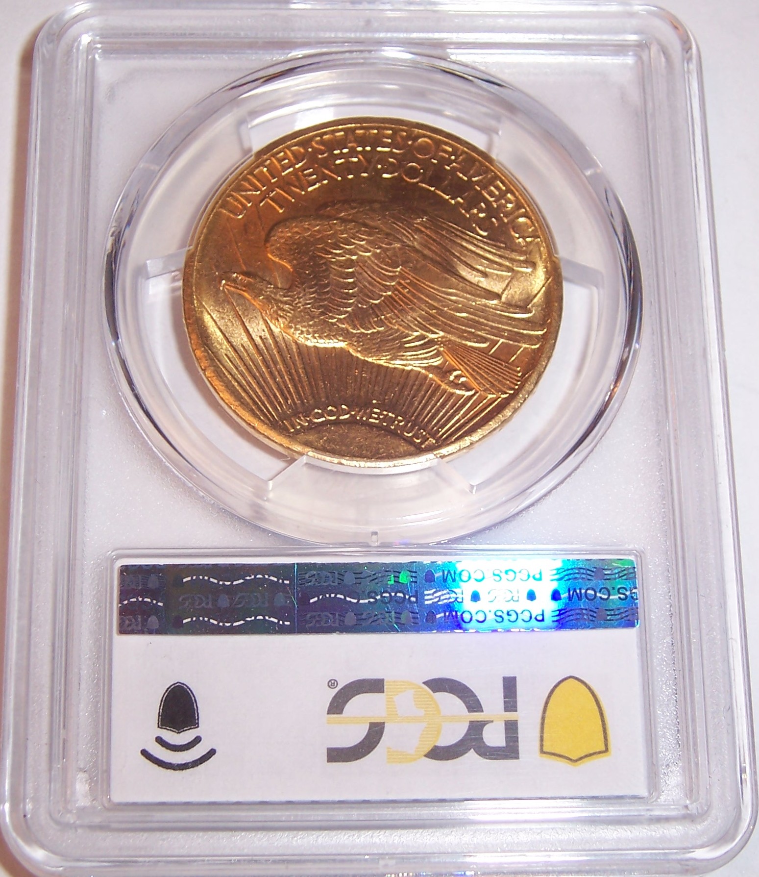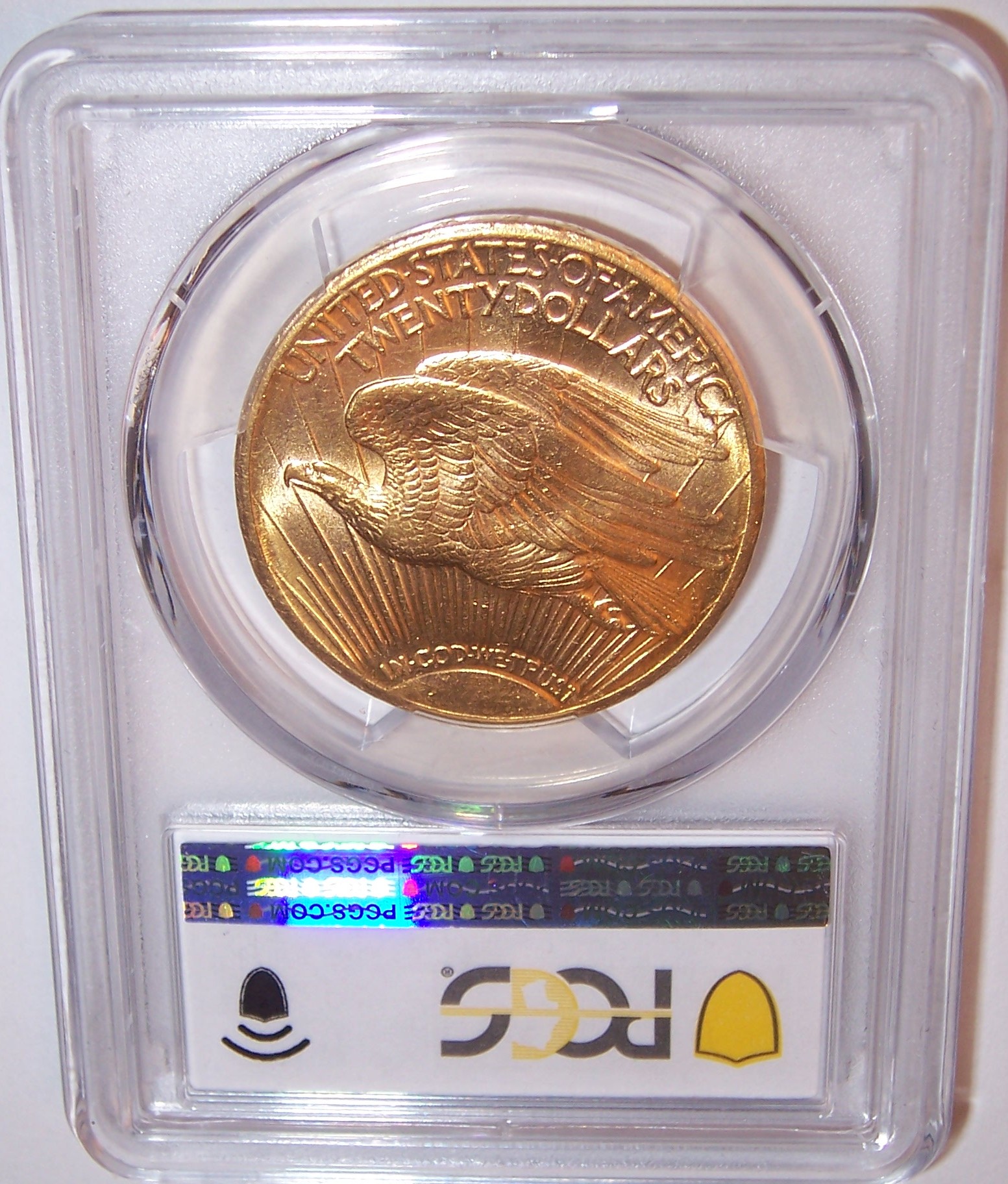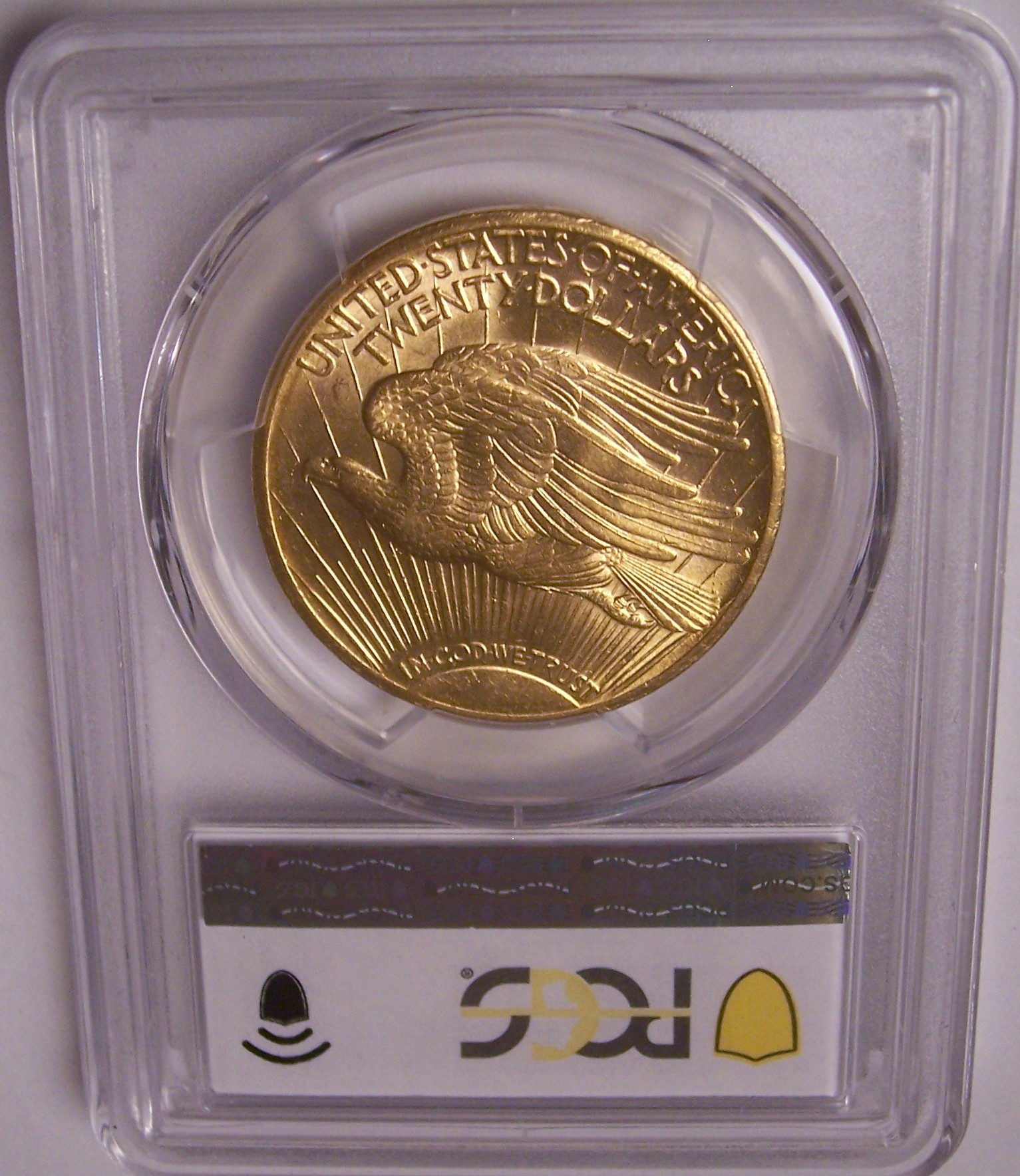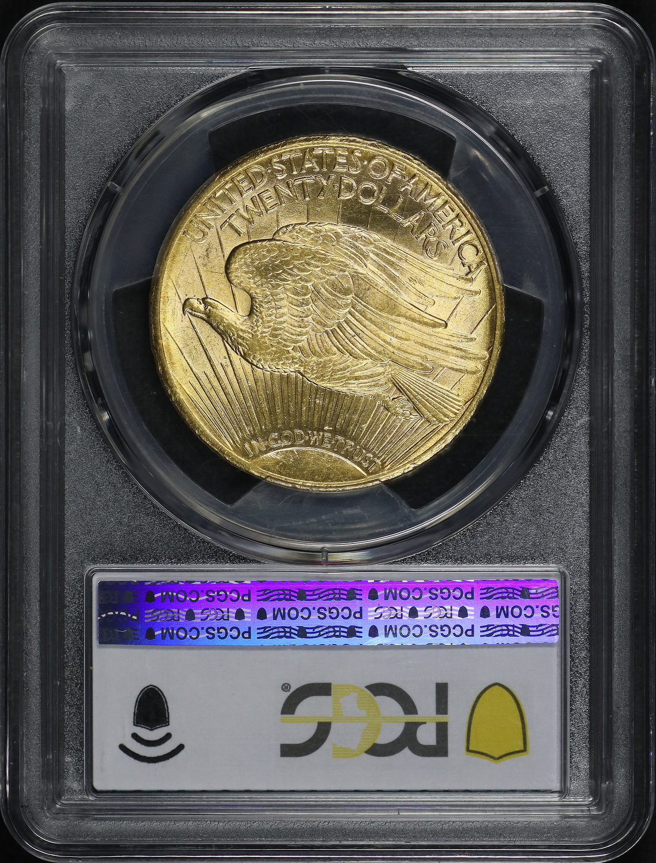 Reverse: A crescent sun appears at the bottom as if rising on the horizon with long rays extending to the top of the coin. A flying eagle covers the central portion, atop the rays. The words UNITED STATES oF AMERICA, TWENTY DOLLARS appear on the top periphery.