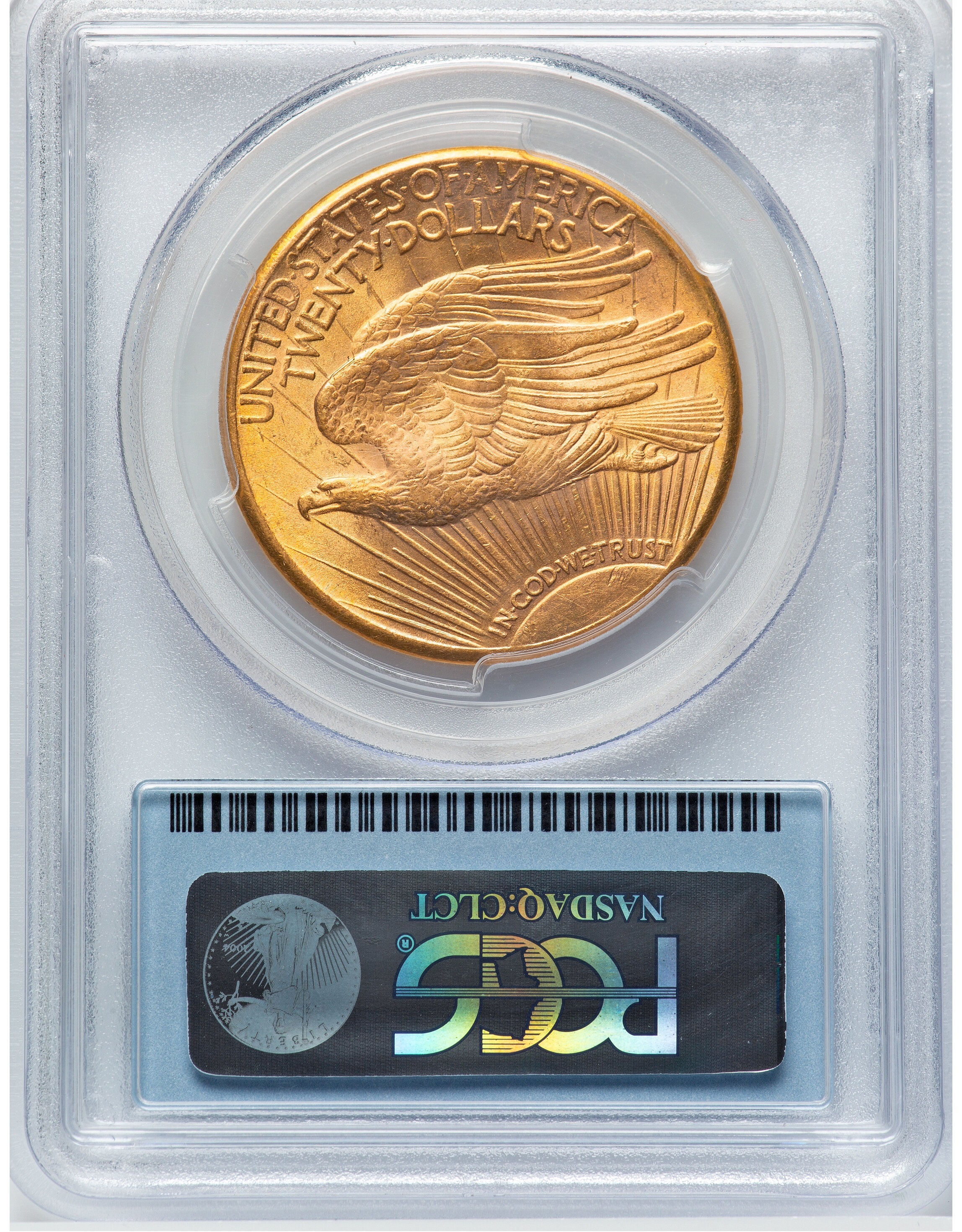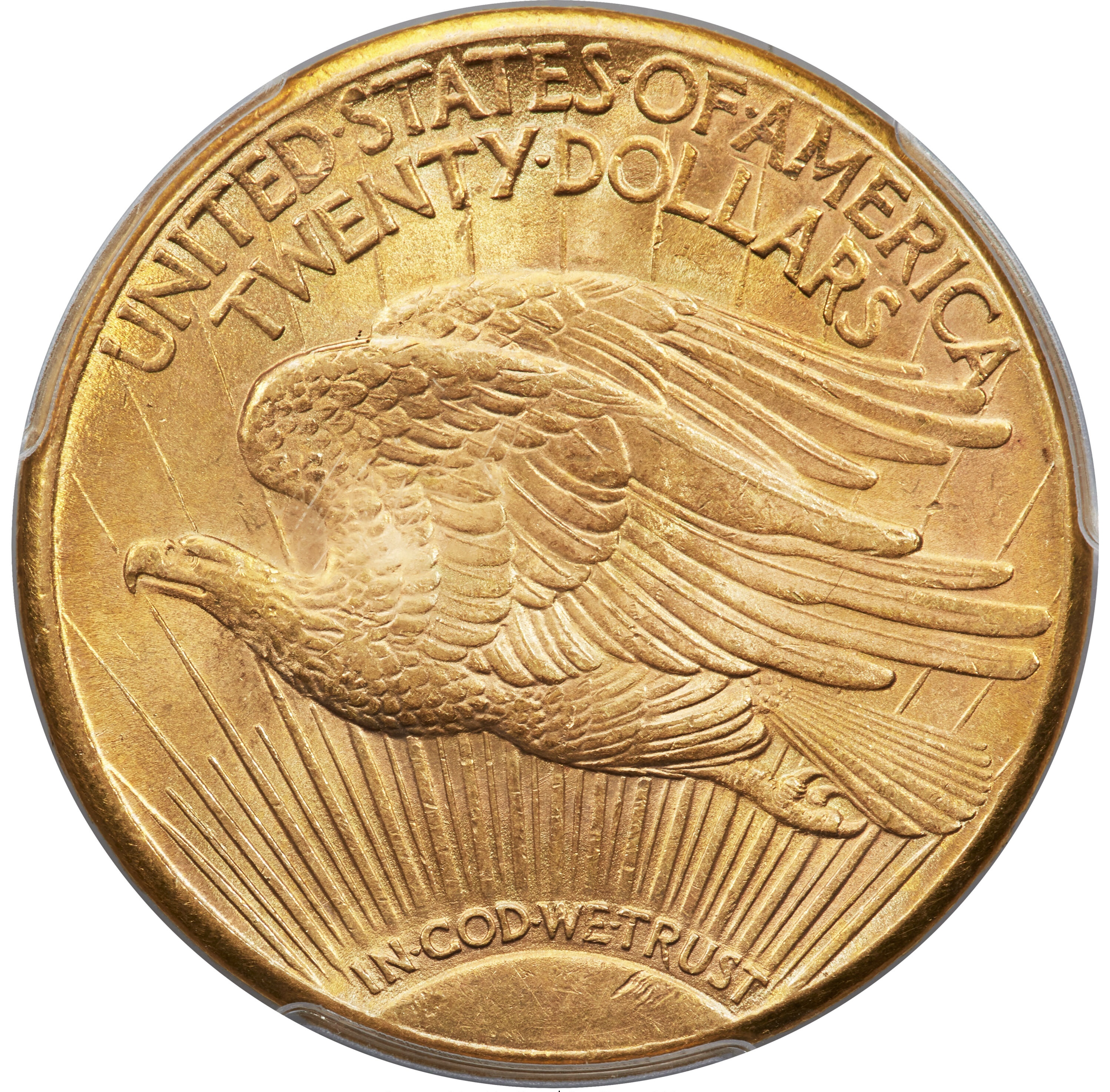 Reverse: A crescent sun appears at the bottom as if rising on the horizon with long rays extending to the top of the coin. A flying eagle covers the central portion, atop the rays. The words UNITED STATES oF AMERICA, TWENTY DOLLARS appear on the top periphery.