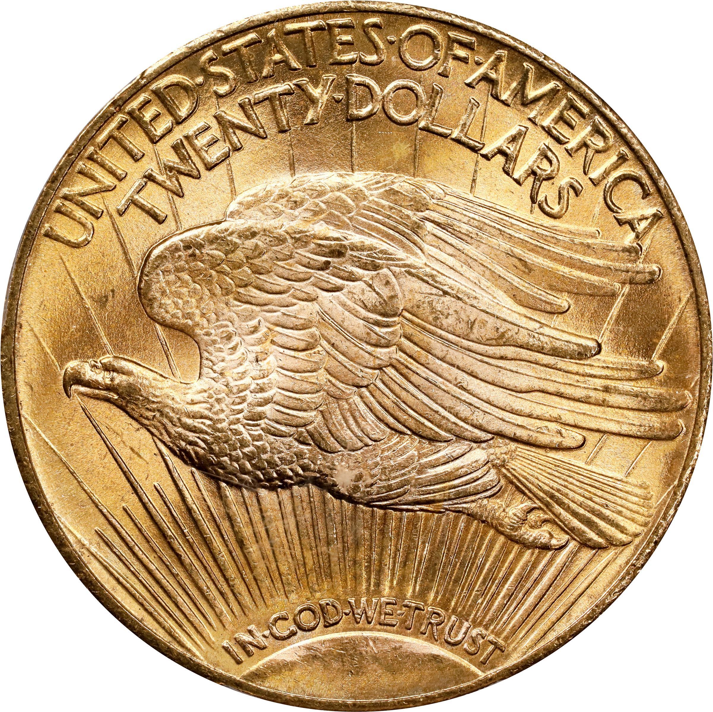 Reverse:A crescent sun appears at the bottom as if rising on the horizon with long rays extending to the top of the coin. A flying eagle covers the central portion, atop the rays. The words UNITED STATES oF AMERICA, TWENTY DOLLARS appear on the top periphery.
