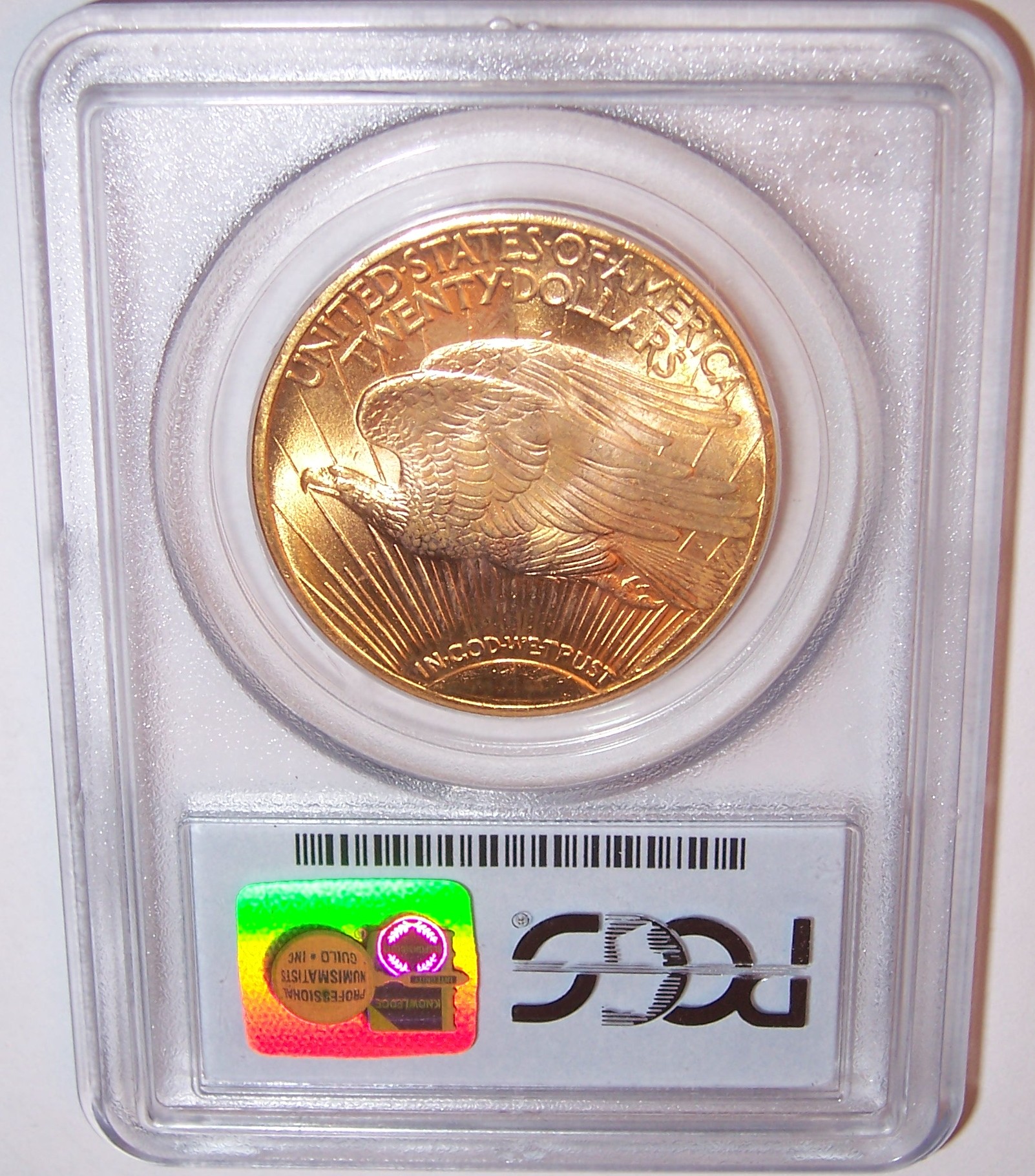 Reverse: A crescent sun appears at the bottom as if rising on the horizon with long rays extending to the top of the coin. A flying eagle covers the central portion, atop the rays. The words UNITED STATES oF AMERICA, TWENTY DOLLARS appear on the top periphery.